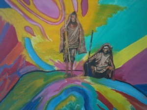 - Le tableau crée une tension entre le visible et l’invisible, entre le réel et le “visionnaire”. Les deux personnages sur la colline pourraient être des figures mythiques, des guides spirituels, ou des incarnations d’une quête intérieure – ils semblent surgir d’un paysage métaphorique plutôt que d’un décor réaliste.
